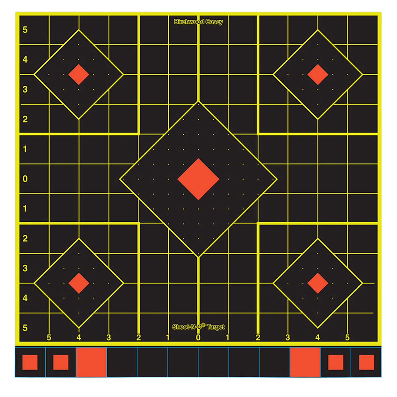 With Birchwood Shoot-N-C Sight-In target bullet holes are revealed with bright chartreuse rings. Five targets on each sheet, use center target for sighting-in and four smaller targets for testing results of various ballistic loads or for confirmation of sight-in groups. The convenient 1″ numbered grid lines simplify scope adjustments. Self adhesive backing makes targets easy to place. Great for indoor or outdoor use and low light conditions. Includes 144 repair pasters to lengthen target life.