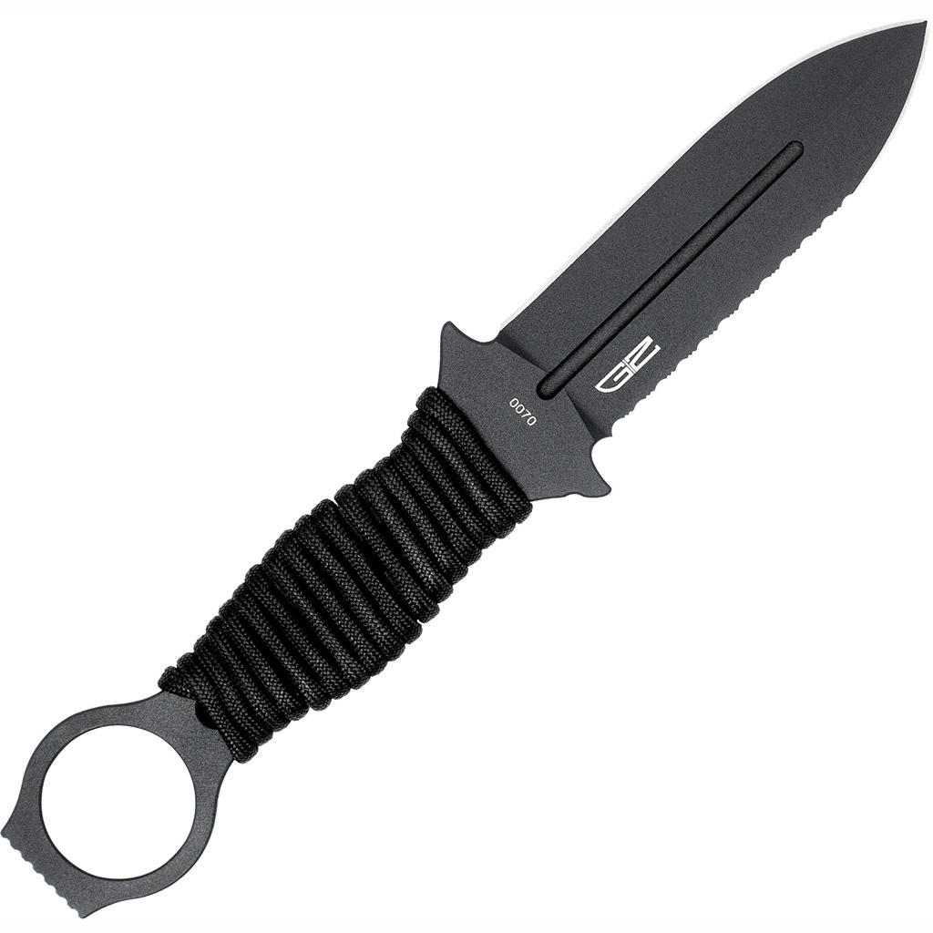 The Ringed Claymore is a compact tactical fixed-blade optimized for military, law enforcement, and first responders, built for rapid deployment and secure retention in high-stress situations. Its 4-inch dagger blade features a non-reflective tactical coating and is available in dual plain or plain/serrated edge configurations. The full-tang skeletonized handle reduces weight and includes an oversized retention ring plus 550 paracord for customizable grip. A slotted Kydex sheath with BladeTech MOLLE-Lok compatibility is included for instant mounting to MOLLE gear.