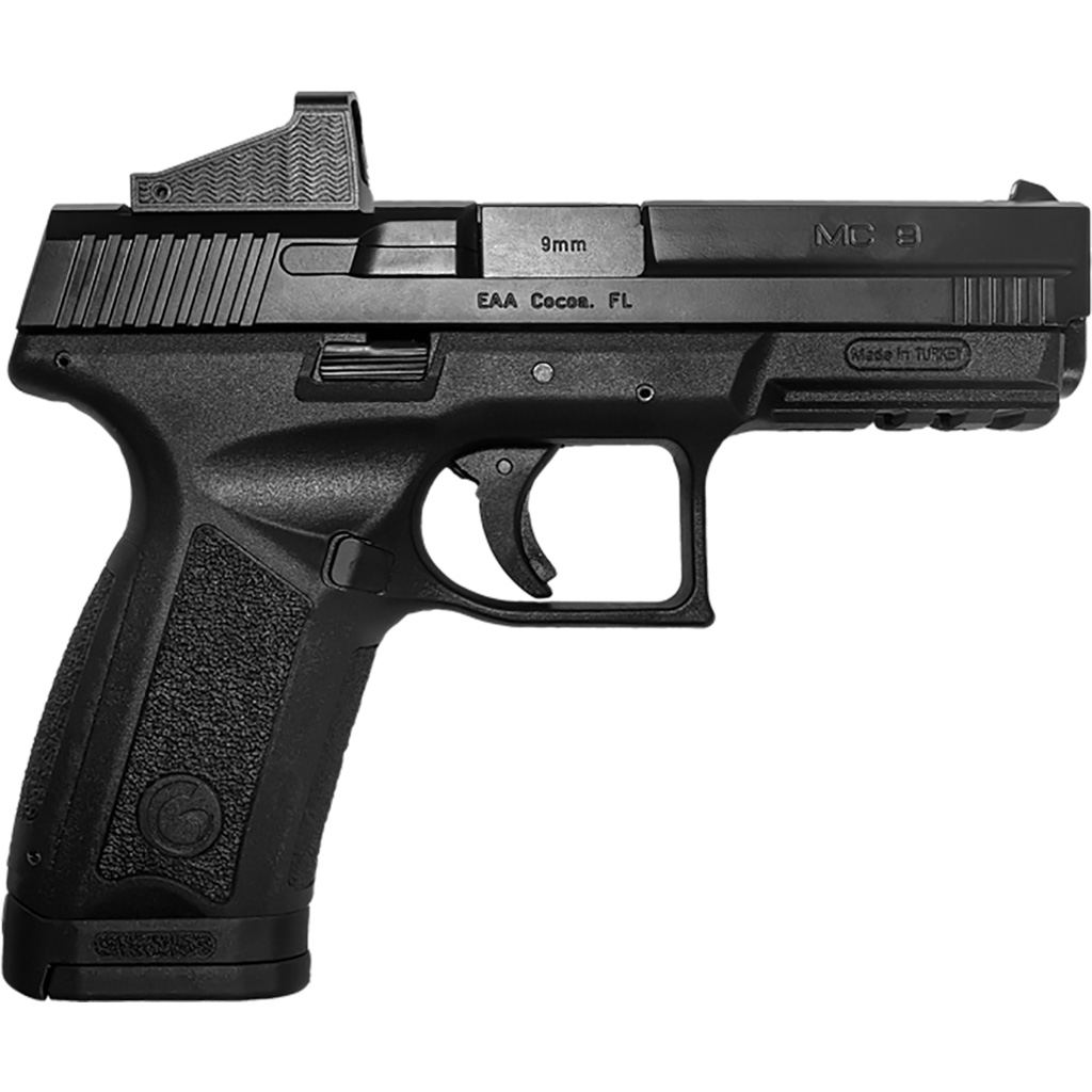 The Girsan MC9 Optics pistol is a semi-auto handgun with a 17 round 9mm capacity. It features a lightweight, ergonomic design equipped with interchangeable backstraps, Picatinny rail, and trigger safety built on a steel slide and polymer frame. This model is compatible with the EAA FAR-DOT System, a red dot and fiber optic rear sight for faster target acquisition while eliminating the hunt for the red dot. This pistol is 7.5? long and weighs 1.4 lbs.