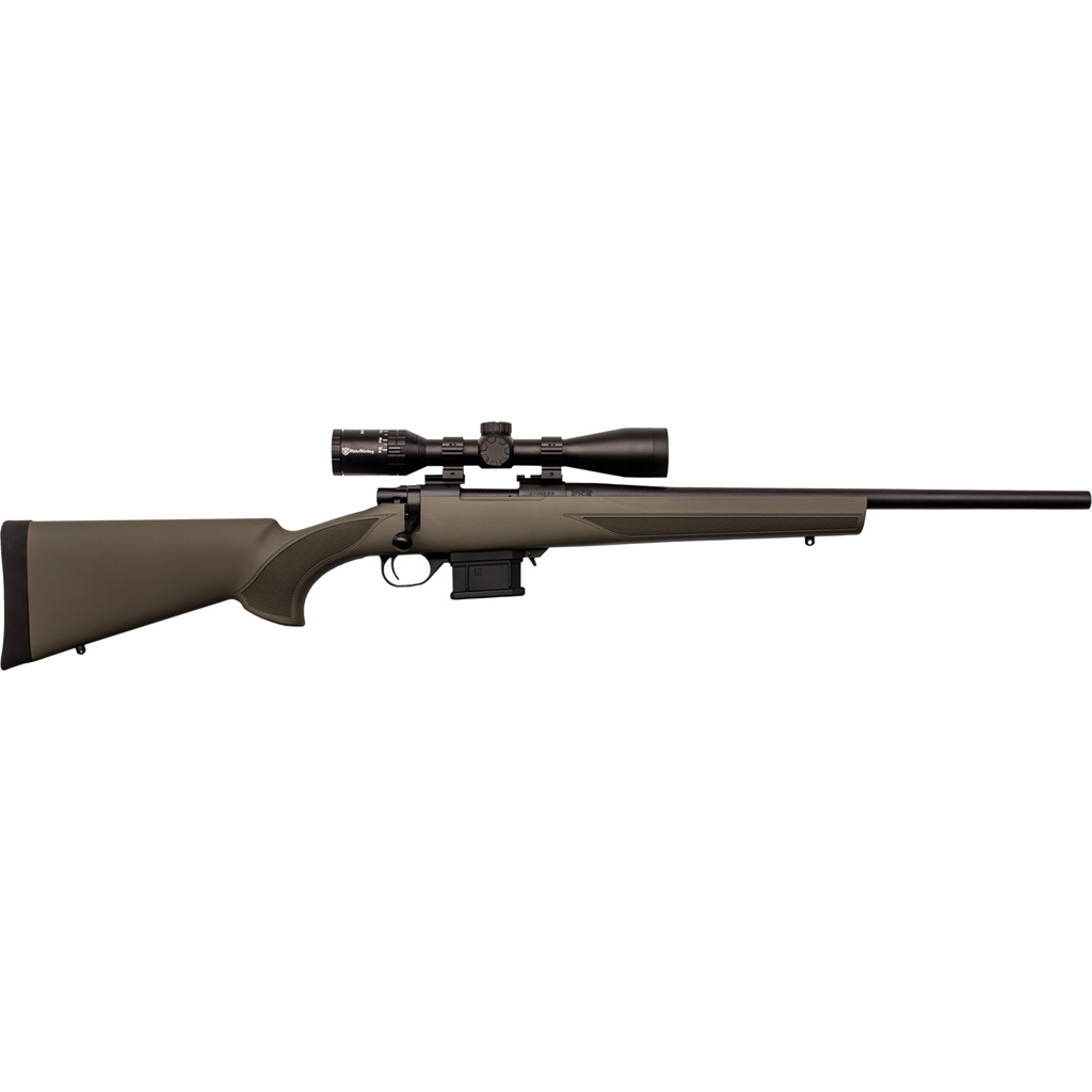 The Mini Action Hunter rifle features a Synthetic green stock, threaded barrel. It has a bolt that is 12 percent shorter than regular short actions. It has a three position safety, and sling swivel studs. Scope Package includes ? Nikko Stirling 4-12?41