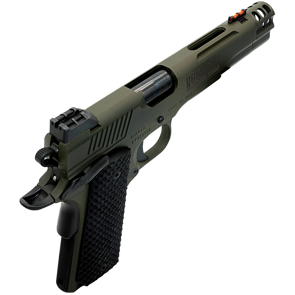 The Kimber Rampart in .38 Super is a high-performance 1911 pistol designed for smooth, flat shooting with enhanced control. It features a 5-inch match-grade barrel with a ported channel and a patent-pending compensator that reduces muzzle rise, providing excellent accuracy and stability. Finished in OD Green Cerakote, this pistol includes Black Lok Custom Boggy G-10 grips and lightening cuts for faster lockup, with Raptor serrations for a firm grip. Outfitted with HIVIZ 3-dot sights, ambidextrous safety, and a 9-round capacity, the Rampart in .38 Super delivers both reliability and style for enthusiasts seeking precision.