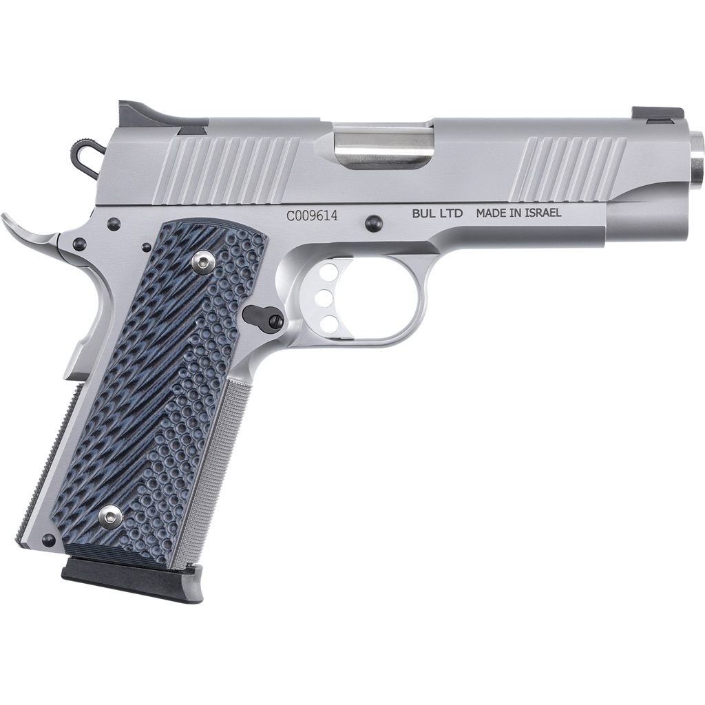 The Desert Eagle 1911 single action model is built with a 4.33 inch Bushingless barrel and shipped with two magazines with extended base pads for positive magazine insertion. The frame is precision cast and machined from high quality steel and the slide is machined from solid billets of steel and then finished in matte stainless steel. The Desert Eagle 1911 features high-ride beavertail grip safety, extended magazine release, aluminum trigger with an overtravel stop, stainless steel full-length guide rod, extended thumb safety, enlarged ejection port, beveled magazine well and G10 grips help in place by stainless steel hex screws.