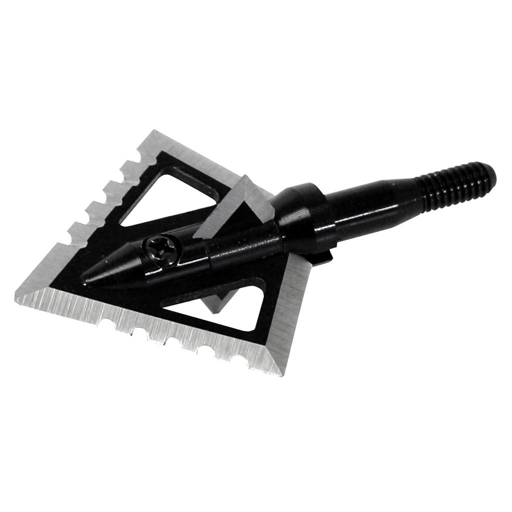 Four blade, fixed blade cut on contact broadhead that features a 1 ¼” cutting diameter on the chiseled serrated edge main blade and a 7/8” cutting diameter on the bleeder blade. Main blade features a thickness of .059 thousands of an inch and the bleeder blade features a .040 thousands of an inch thickness. Made of knife grade stainless steel with a patented diamond tip.