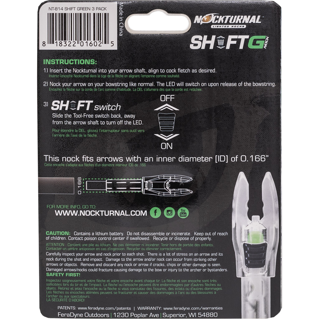 Elevate your archery experience with the Nockturnal Shift FIT lighted nocks, designed to redefine the standards of reliability and user-friendliness in lighted nocks. Featuring a bowstring-activated linear switch, these nocks illuminate ultra-bright LEDs with a simple slide of the external on/off switch, allowing for effortless operation. Constructed from super strong, clear polycarbonate that’s both impact-resistant and durable, these nocks are built to withstand the rigors of use in any environment. They fit .166 ID arrows and come in a pack of three with universal FIT collars.