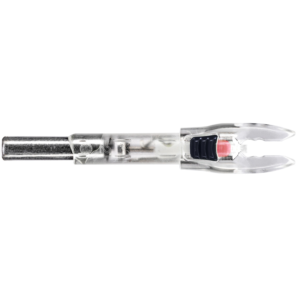 The Nockturnal Shift Universal Easy Off Nock System with FIT Technology sets a new standard in lighted nock design. These lighted nocks offer unparalleled simplicity and reliability, featuring an external on/off switch that allows for effortless control. Just slide the switch to turn off the ultra-bright, string-activated LED light. With a durable polycarbonate casing, these nocks are both waterproof and shockproof, ensuring they withstand the toughest conditions. Boasting over 20 hours of battery life, the Nockturnal Shift FIT lighted nocks are designed to last. The patented, piston-driven contact linear switch activates the light immediately upon string release, providing instant illumination.