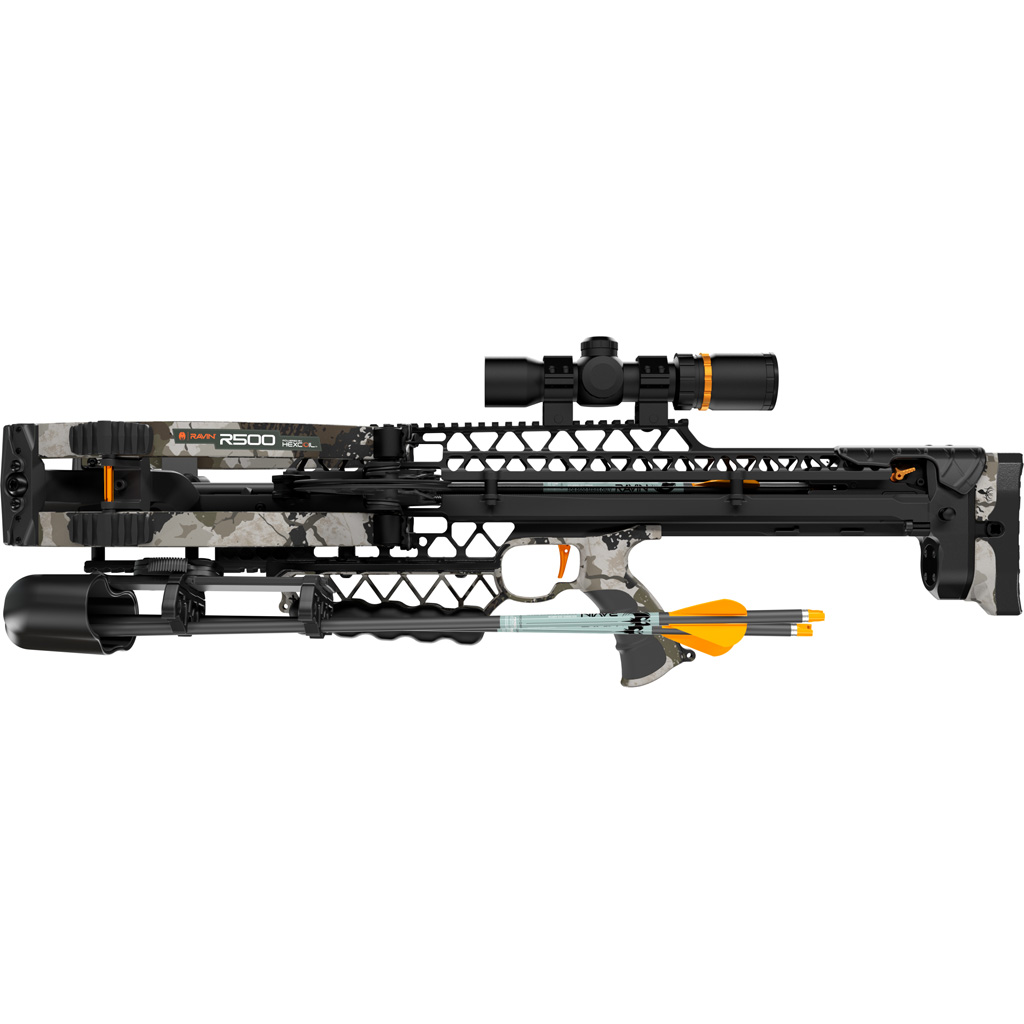 The Ravin R500 Crossbow Package in Kings XK7 Camo delivers groundbreaking speed, accuracy, and stealth for elite hunters. Firing arrows at a blistering 500 feet per second with 222 foot-pounds of kinetic energy, it features Ravin’s revolutionary HexCoil Cam System that rotates the cams 360 degrees for unmatched performance and compact design. Outfitted with the VersaDrive silent cocking system, anti-dry fire/auto safety, and built-in sling mounts, the R500 is both safe and easy to handle. Finished in Kings XK7 Camo, this package includes a 100-yard illuminated 550 FPS scope, three .003 R500 Series arrows with field points, a removable draw handle, and a quiver with mounting bracket.