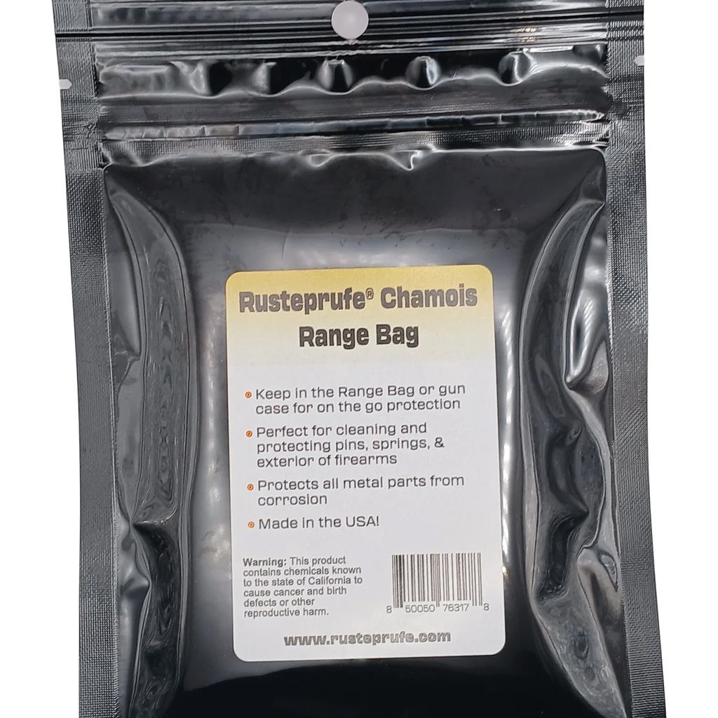 The Rusteprufe Chamois Range Bag provides a compact solution for protecting firearms and metal gear from rust and corrosion in the field. It includes a reusable chamois cloth pre-treated with a solvent and rust-preventive oil formula that leaves a thin protective coating on metal surfaces. The cloth is stored in a resealable mylar zip-top bag that keeps it clean and ready for use during travel or range trips. When the cloth begins to dry, it can be recharged with additional oil to extend its service life.