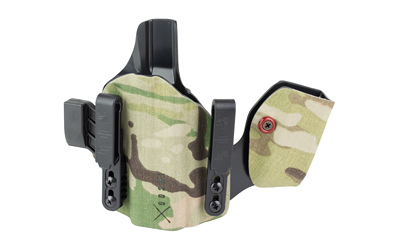 An ergonomic, mission-adjustable, RDS-compatible, multi-positional, deep concealment IWB hybrid thermoplastic holster. Its distinctive features enable concealed carry for a wide range of handgun fits from various carry positions while allowing a full firing grip prior to drawing. The design includes passive retention and adjustable tension, enabling a finely tuned fit and smooth draw. This evolution of the IncogX features a series of clips that provide more adaptability to the user while maintaining the original goals of improved grip, concealment, and function. The clips open outward and slide down with the holster, naturally locking over the belt. An actuated finger tab flexes to open, allowing quick installation or removal from the belt. An improved clip strut design combines functionality with customized concealment shims that can be easily installed or removed without tools. All IncogX models come with clip strut shims in three different concealment sizes: 1/8″, 1/4″, and 3/8″.