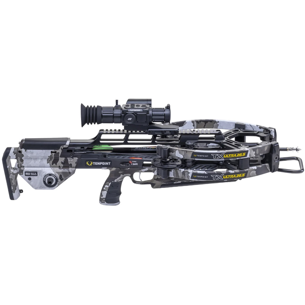 The TX Ultra 26.5 w/Vision HD Digital Rangefinding Scope with recording capability is a forward-draw crossbow measuring 26.5 inches long and 7 inches wide, with a rated speed of 410 fps. It features Twin-Riser Technology, a TriggerTech trigger, and an AR-style ambidextrous thumb safety, along with a rail-less ZERO-Trac barrel and an ACU-Lock Scope Bridge. Zero-Torsion Technology combines 0.315-inch axles and X-Wide limbs to reduce torsional movement for consistent shot-to-shot performance. This package includes ACUslide MAXX for cocking and de-cocking, a Burris Oracle X Rangefinding Scope, a 3-pack of ACU-X 20 carbon arrows, plus an integrated string stop, quiver, and bow hanger.