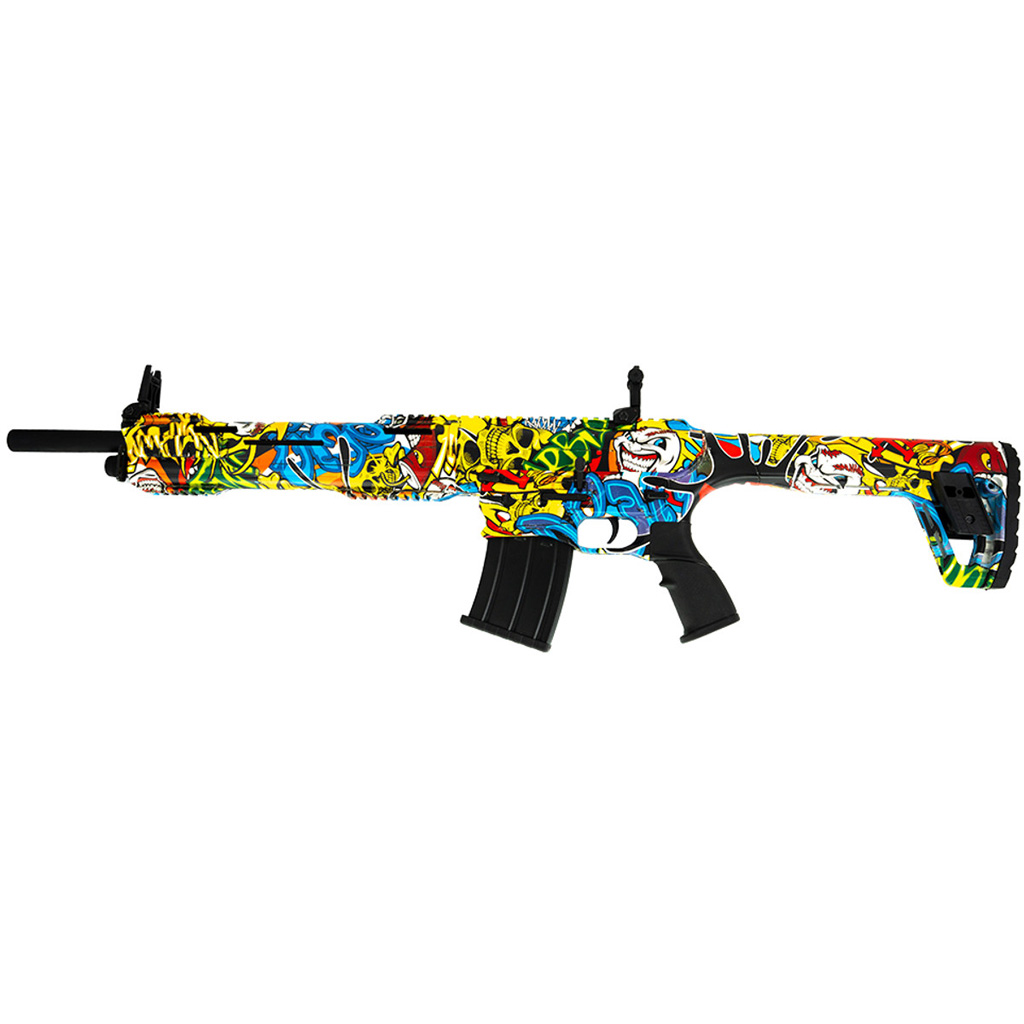 The Tokarev TAR 12 SB shotgun blends AR-style ergonomics with shotgun power, featuring an 18.5″” barrel within a 12-gauge platform. The shotgun has a hydro-dipped “”Sticker Bomb”” finish, 5-round magazine capacity, and polymer flip-up sights. It is compatible with Benelli/Mobil choke tubes and offers extensive rail space for accessories.