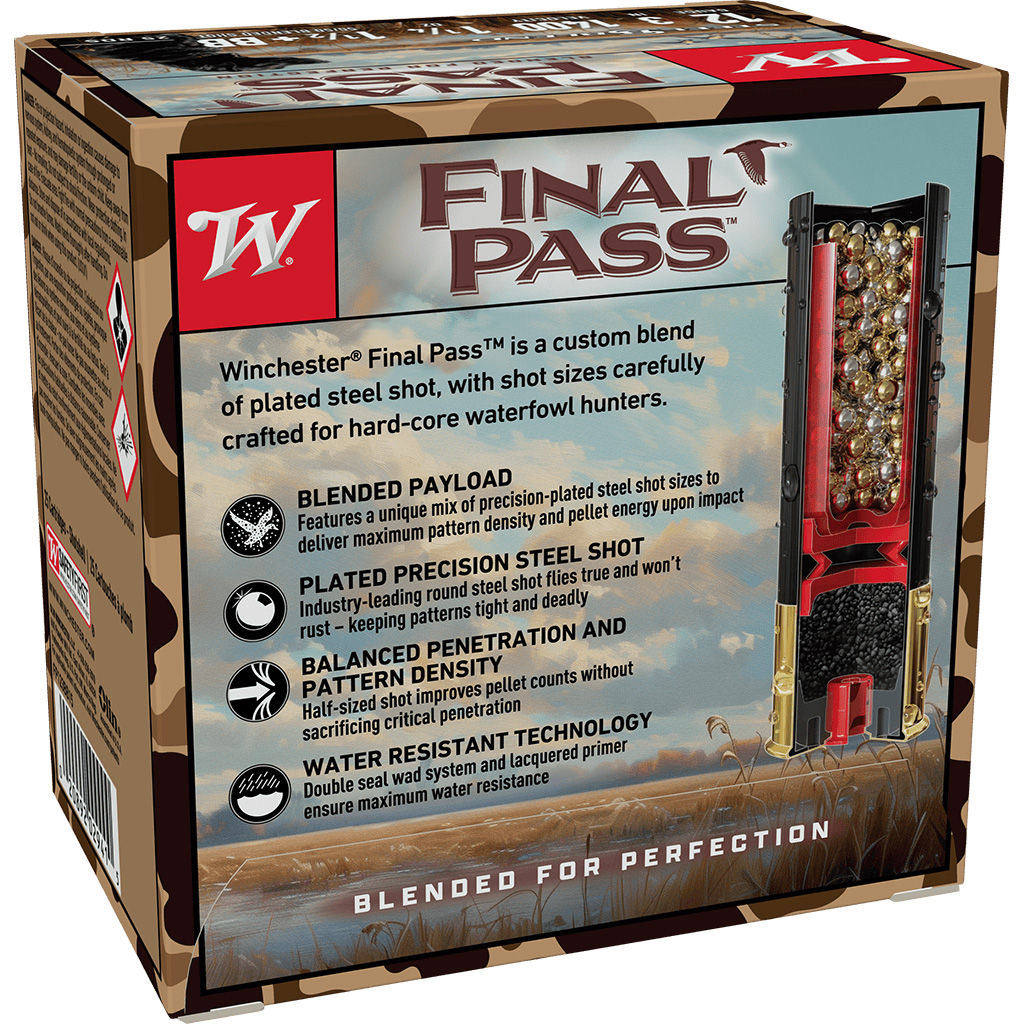 The Winchester Final Pass 12 Gauge Shotgun Ammo delivers solid performance with a 3-inch shell loaded with a 1 1/4-ounce blend of BB and 1.5 shot sizes. Designed for high-impact delivery, this load achieves a muzzle velocity of 1400 feet per second for consistent accuracy and range.